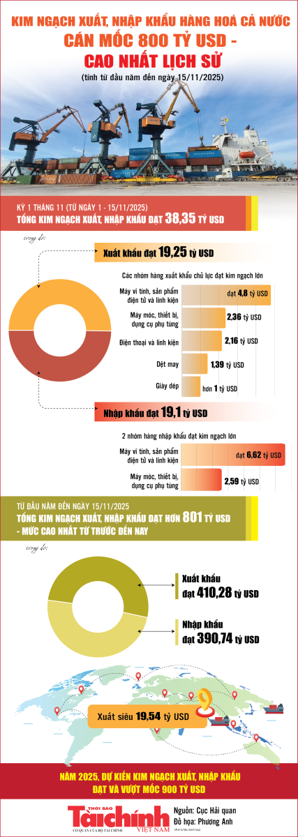 Theo Cục Hải quan, tính từ đầu năm đến 15/11/2025, quy mô kim ngạch xuất, nhập khẩu cả nước đạt hơn 801 tỷ USD. Trong đó, xuất khẩu đạt 410,28 tỷ USD; nhập khẩu đạt 390,74 tỷ USD; cán cân thương mại thặng dư 19,54 tỷ USD.
