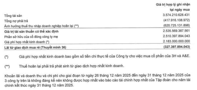 Theo báo cáo, tổng tài sản của nhóm công ty được mua lại đạt khoảng 3.574 tỷ đồng, trong khi nợ phải trả là 418 tỷ đồng và nghĩa vụ thuế thu nhập hoãn lại phát sinh 621 tỷ đồng.