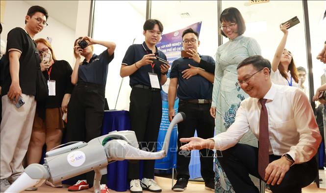 Các đại biểu tham quan triển lãm công nghệ trong chương trình lễ khánh thành Tòa nhà Trung tâm Khởi nghiệp sáng tạo Thành phố Hồ Chí Minh (SIHUB). Ảnh: Thu Hoài/TTXVN