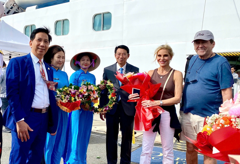 Lãnh đạo tỉnh Khánh Hòa chào đón, tặng hoa thủy thủ tàu biển Oceania Riviera và những du khách đầu tiên.