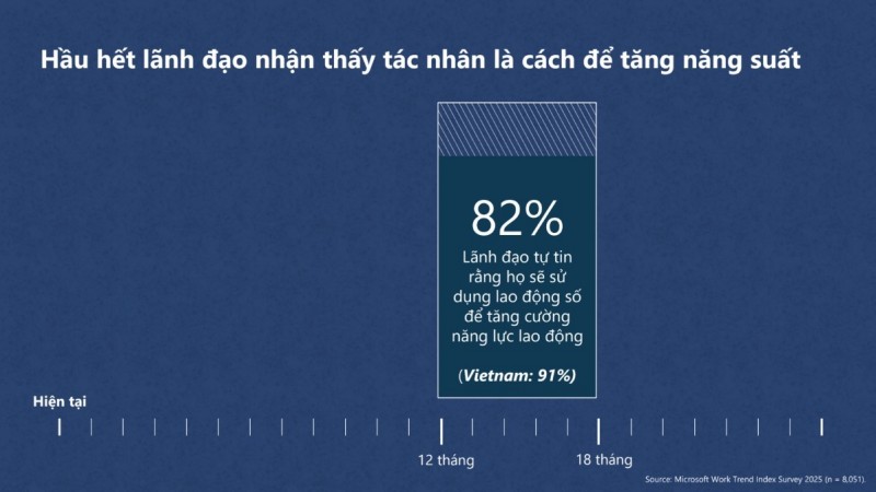 Theo báo cáo Chỉ số xu hướng công việc (Work Trend Index) năm 2025 được Microsoft mới công bố dựa trên khảo sát về mức độ tự tin trong việc đưa tác nhân AI (AI Agent) vào lực lượng lao động như một thành viên kỹ thuật số trong 12-18 tháng tới, có 82% số lãnh đạo doanh nghiệp được hỏi trên toàn cầu bày tỏ mức độ tự tin trên trung bình. Tại Việt Nam, con số này là 95%, ngang bằng với Indonesia và cao hơn so với kết quả khảo sát tại Mỹ (82%), Trung Quốc (85%) và Pháp (71%).