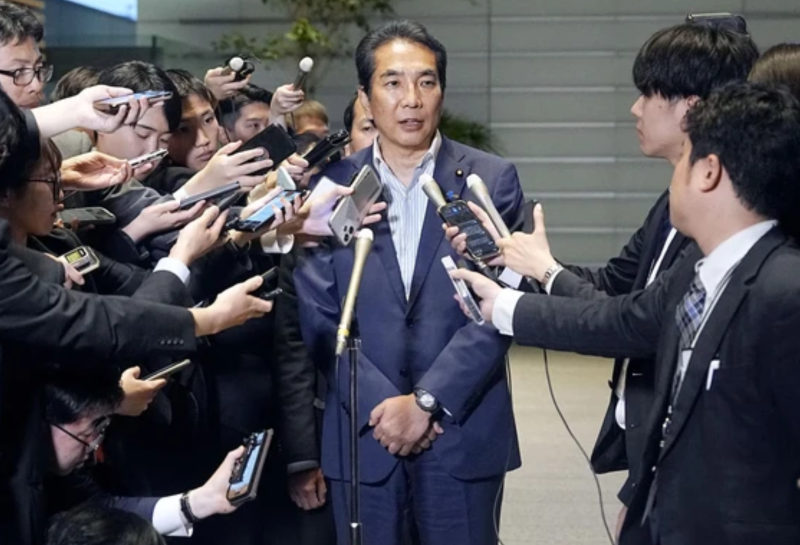 Bộ trưởng Bộ Nông nghiệp, Lâm nghiệp và Thủy sản đã từ chức Taku Eto phát biểu với giới truyền thông về những bình luận gây tranh cãi của ông về việc nhận gạo từ những người ủng hộ, ngày 19/5/2025 Ảnh: Kyodo