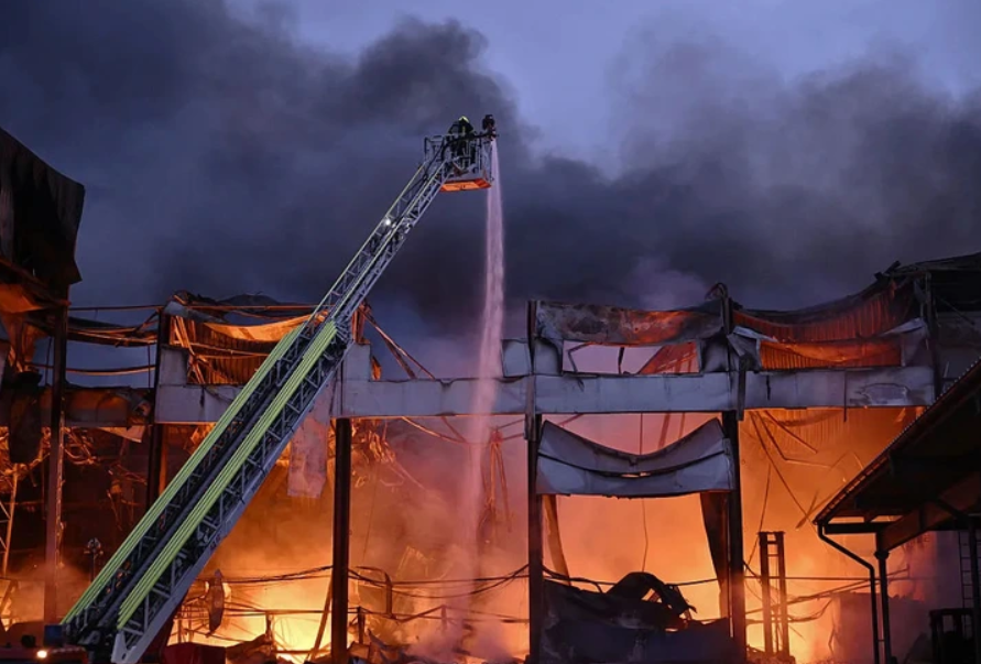 Một kho thực phẩm ở thủ đô Kiev, Ukraine bốc cháy sau vụ tấn công bằng tên lửa từ phía Nga hôm 25-10 - Ảnh: AFP