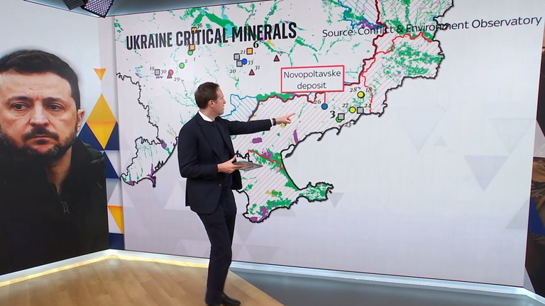 Tổng thống Ukraine, Zelensky (ảnh bên) đang đối diện bài toán khó khi được yêu cầu chia sẻ tài nguyên khoáng sản của Ukraine với Mỹ để bù đáp lại viện trợ của Washington cho Kiev. Ảnh: GI/Sky News
