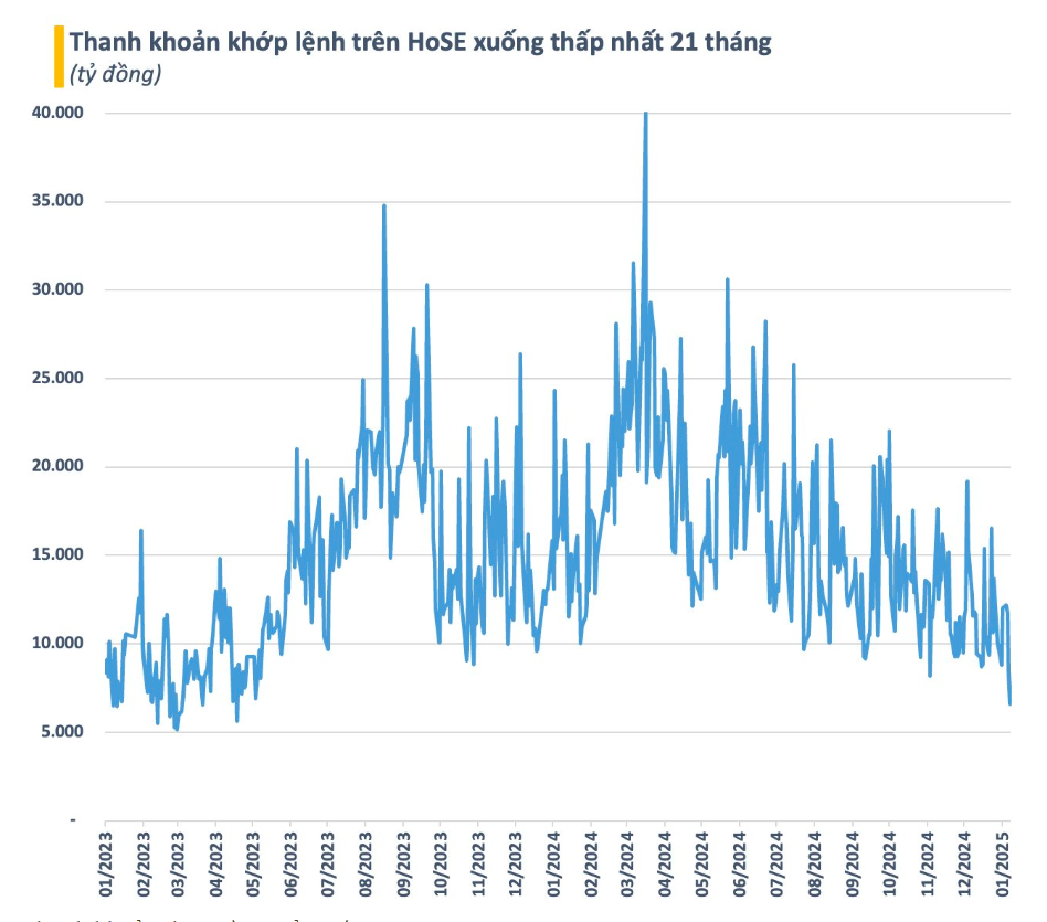 Không chỉ trồi sụt về mặt điểm số, thanh khoản cũng trở nên “mất hút”. Tần suất các phiên giao dịch giá trị thấp xuất hiện khá dày. Điển hình, phiên 9/1 mới đây, giá trị khớp lệnh trên HoSE chỉ đạt hơn 6.600 tỷ đồng, thấp nhất trong vòng 21 tháng. Đáng chú ý, đà sụt giảm của thanh khoản không chỉ diễn ra mới đây mà đã hình thành xu hướng rõ rệt từ giữa năm ngoái.