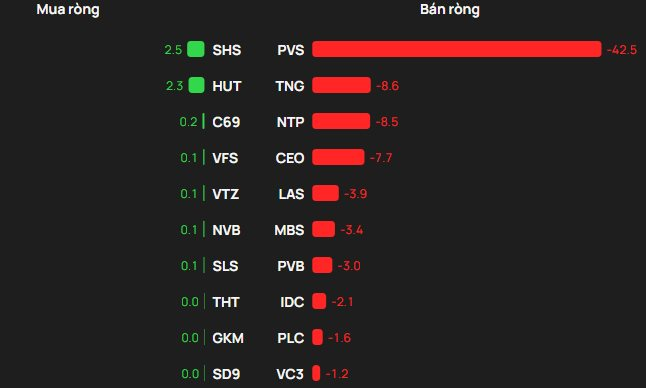 Ở chiều bán ròng, PVS là mã chịu áp lực xả mạnh nhất với giá trị lên tới 43 tỷ đồng. Theo sau là TNG (9 tỷ đồng), NTP (9tỷ đồng), CEO (8 tỷ đồng), LAS (4 tỷ đồng).