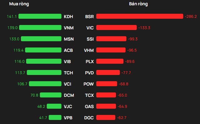 Ở chiều ngược lại, áp lực bán ròng tập trung mạnh nhất tại BSR với giá trị khoảng 286 tỷ đồng, bỏ xa các mã còn lại. Theo sau là VIC (133 tỷ đồng), SSI (99 tỷ đồng), VHM (97 tỷ đồng), PLX (90 tỷ đồng). Một số cổ phiếu khác như PVD, POW, TCX, GAS và DGC cũng nằm trong danh sách bị bán ròng mạnh.