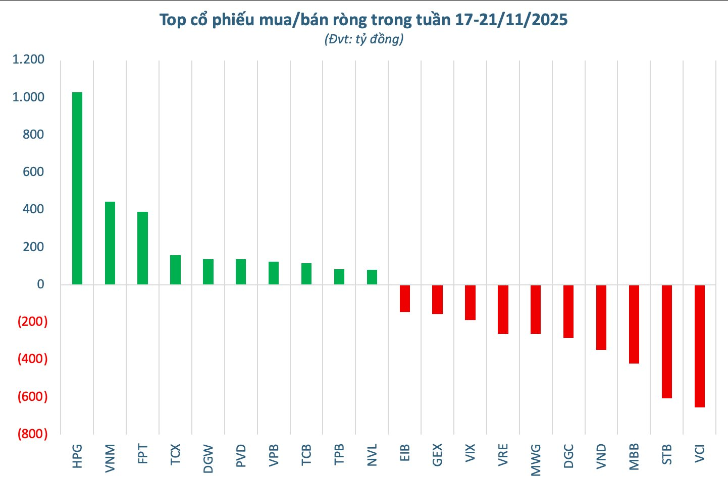Ở chiều ngược lại, dẫn đầu lực mua ròng là HPG với giá trị 1.028 tỷ đồng, bỏ xa phần còn lại. Xếp tiếp theo là VNM (446 tỷ đồng), FPT (392 tỷ đồng) và TCX (158 tỷ đồng). Một số mã khác cũng ghi nhận dòng tiền vào tích cực như DGW (139 tỷ đồng), PVD (137 tỷ đồng), VPB (125 tỷ đồng), TCB (116 tỷ đồng), TPB (85 tỷ đồng) và NVL (81 tỷ đồng).