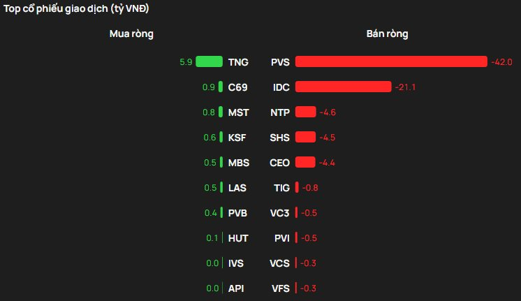 Chiều ngược lại, PVS là mã chịu áp lực bán ròng của khối ngoại với giá trị gần 42 tỷ đồng; theo sau IDC bị bán 21tỷ, NTP, SHS, CEO bị bán từ vài tỷ đồng.
