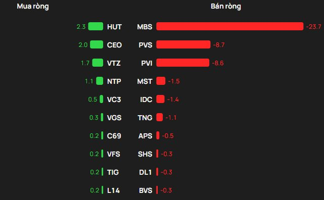 Chiều ngược lại, HUT dẫn đầu danh sách được mua ròng với giá trị khoảng 2,3 tỷ đồng. Xếp sau là CEO (+2 tỷ đồng) và VTZ (+1,7 tỷ đồng). NTP và VC3 cũng được mua ròng với giá trị không đáng kể.