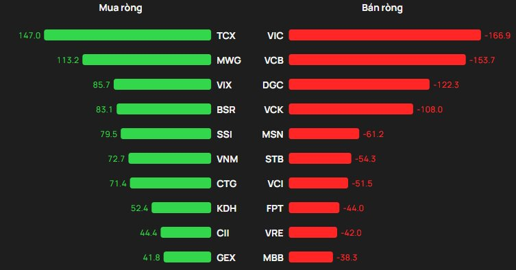 Chiều ngược lại, TCX dẫn đầu danh sách được mua ròng với giá trị khoảng 147 tỷ đồng. Đứng thứ hai là MWG, được khối ngoại giải ngân khoảng 113 tỷ đồng, theo sau là VIX (gần 86 tỷ đồng) và BSR (khoảng 83 tỷ đồng). SSI cũng được mua ròng mạnh với gần 80 tỷ đồng, cùng các mã VNM, CTG, KDH, CII, GEX tiếp tục thu hút dòng vốn ngoại.