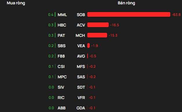 Chiều ngược lại, nhóm được mua ròng nhìn chung giá trị khá nhỏ, dẫn đầu là MML, HBC và PAT. Tiếp đến là SBS và F88 lần lượt được mua ròng khoảng 200 triệu đồng mỗi mã.