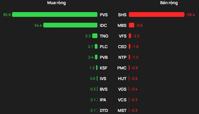 Chiều mua ghi nhận PVS dẫn đầu danh sách mua ròng với khoảng 86 tỷ đồng, theo sau là IDC (xấp xỉ 54 tỷ) và TNG (khoảng 5 tỷ). Các mã PLC (gần 3 tỷ) và PVB (xấp xỉ 2 tỷ) cũng được mua ròng đáng kể trong top 5.