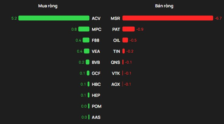 Ở chiều ngược lại, lực bán ròng tập trung chủ yếu vào MSR với khoảng 7 tỷ đồng, kế đến là PAT (gần 1 tỷ) và OIL (khoảng 0,5 tỷ). Hai mã còn lại trong nhóm bán ròng nhiều nhất là TIN (xấp xỉ 0,2 tỷ) và QNS (khoảng 0,1 tỷ).