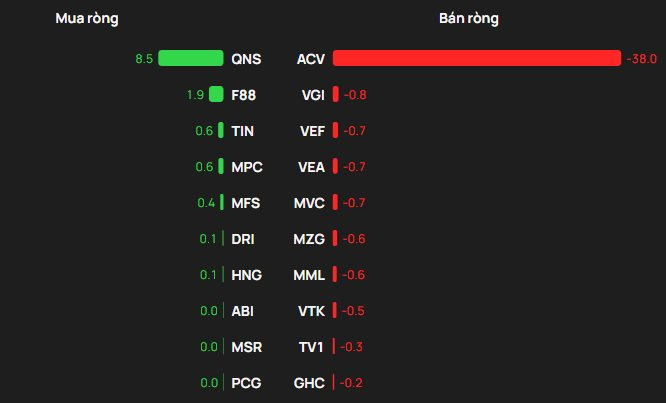 Chiều ngược lại, khối ngoại bán ròng áp đảo tại ACV với quy mô khoảng 38 tỷ đồng; các mã VGI (-1 tỷ), VEF (-1 tỷ), VEA (-1 tỷ) và MVC (-1 tỷ) tiếp tục ghi nhận lực bán ròng đáng chú ý trên sàn UPCoM.