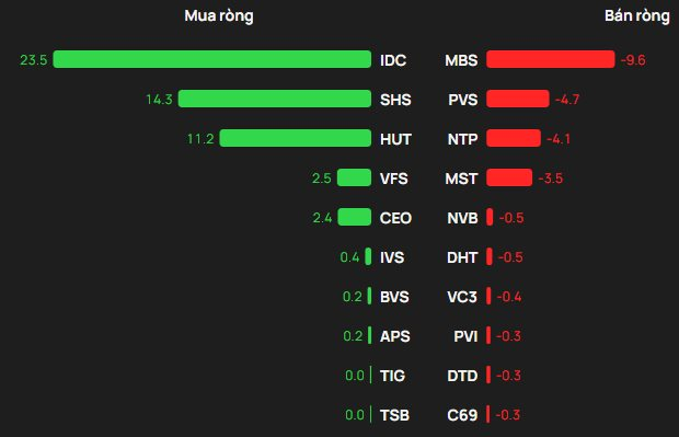 Tại chiều mua, IDC được mua ròng mạnh nhất với giá trị 23 tỷ đồng. Bên cạnh đó, SHS xếp tiếp theo trong sách mua ròng mạnh trên HNX với 14 tỷ đồng. Ngoài ra, khối ngoại cũng chi vài tỷ đồng để gom ròng HUT, VFS, CEO.