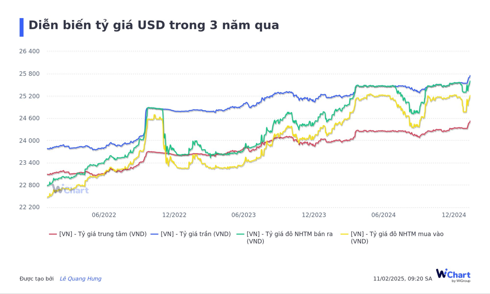 Tại các ngân hàng, việc NHNN liên tục tăng mạnh tỷ giá trung tâm khiến tỷ giá USD bán ra không còn kịch trần như giai đoạn cuối năm 2024. Tuy nhiên, trong vòng 1 tuần qua, tỷ giá USD niêm yết đã tăng khoảng 300 đồng ở chiều bán và tăng khoảng 450 đồng ở chiều mua vào. Giá mua tăng nhanh hơn giá bán cho thấy các ngân hàng vẫn đang kỳ vọng tỷ giá sẽ tiếp tục tăng trong thời gian tới.