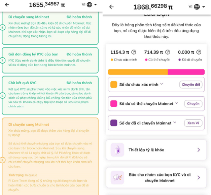 Để rút Pi về ví, người dùng phải xác minh danh tính và chuyển Pi sang Mainnet. Nhiều người dùng cho biết bị treo ở 2 bước này: “Em đợi từ năm 2023 đến nay vẫn chưa xanh”, “Mình đào Pi mà mãi Pi nó không về ví”, “Chờ 3 năm rồi mà Pi vẫn chưa về ví đây”...