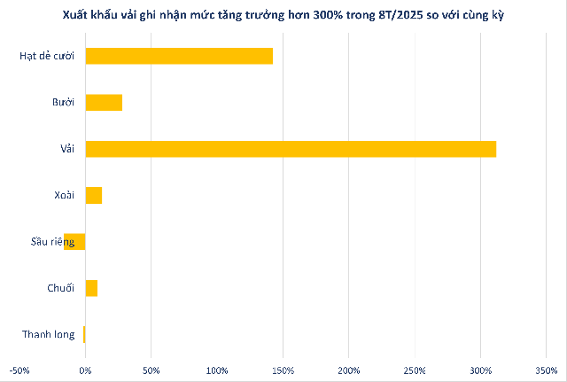 Song song với đó, Trung Quốc - thị trường truyền thống - cũng đang cho thấy dấu hiệu phục hồi ổn định. Bên cạnh sầu riêng lấy lại đà tăng, nhiều mặt hàng rau quả xuất khẩu khác cũng chứng kiến tăng trưởng mạnh. Trong đó, vải ghi dấu với kim ngạch xuất khẩu đạt gần 3 triệu USD, tăng khủng 5.600% so với tháng 8 năm 2024. Lũy kế đầu năm, mặt hàng này giúp Việt Nam thu về hơn 72 triệu USD, tăng 300% so với cùng kỳ.