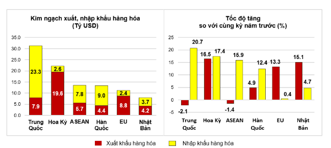 Về thị trường, Mỹ là thị trường xuất khẩu lớn nhất của Việt Nam với kim ngạch đạt 19,6 tỷ USD. Trung Quốc là thị trường nhập khẩu lớn nhất của Việt Nam với kim ngạch đạt 23,3 tỷ USD.