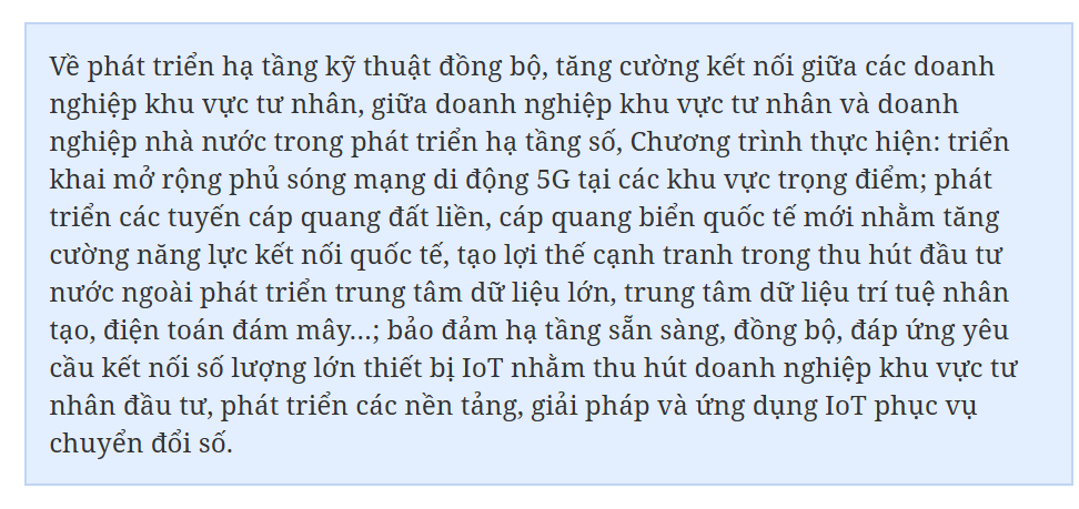 Đồng thời, Chương trình thực hiện hoàn thiện hành lang pháp lý thuận lợi, minh bạch và khuyến khích đầu tư phát triển hạ tầng số: điều chỉnh chính sách ưu đãi, hỗ trợ phù hợp, thực chất đối với các doanh nghiệp phát triển các sản phẩm, dịch vụ hạ tầng số thuộc danh mục công nghệ cao; nghiên cứu có chính sách ưu tiên đối với các doanh nghiệp phát triển sản phẩm "Make in Vietnam"...