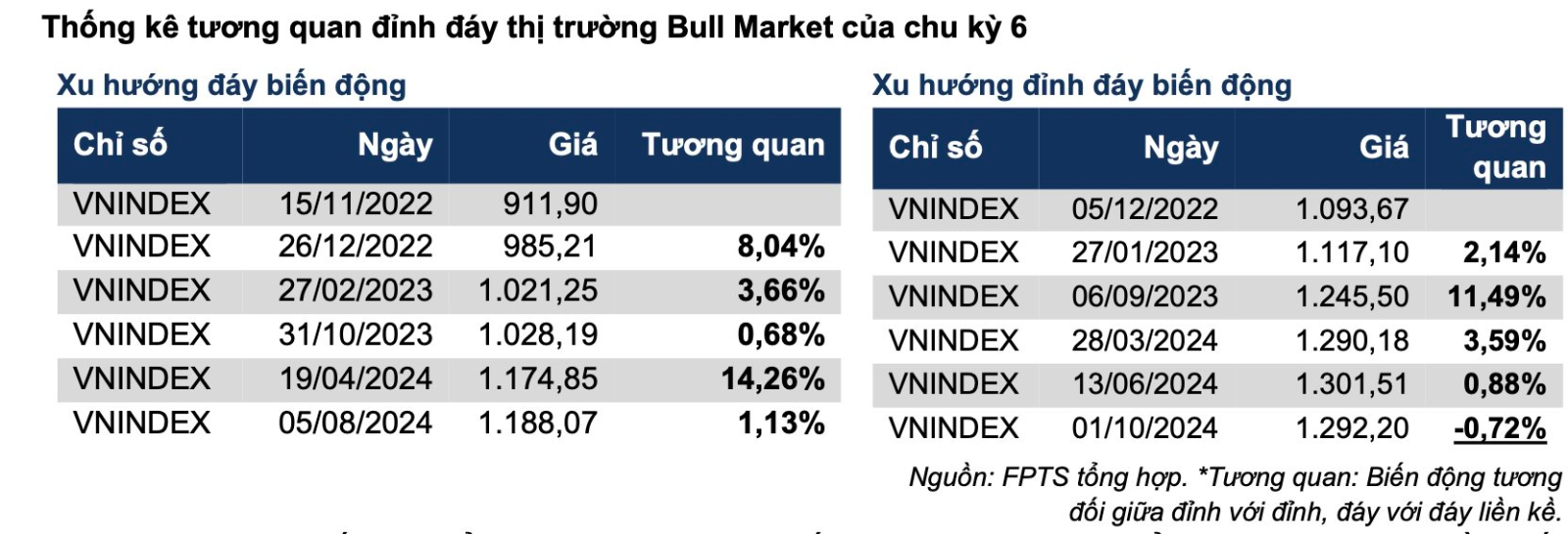 Tính đến quý 4/2024, thị trường đã bước vào giai đoạn Late Bull Market (giai đoạn cuối của pha tăng giá) để ngỏ diễn biến kế tiếp nằm trong kịch bản của thị trường Bear Market (thị trường gấu). Trong lịch sử biến động của VN-Index, thị trường Bear Market xuất hiện dưới 2 dạng: xu hướng giảm (Downtrend) và xu hướng đi ngang trong khoảng rộng (Choppy Market).