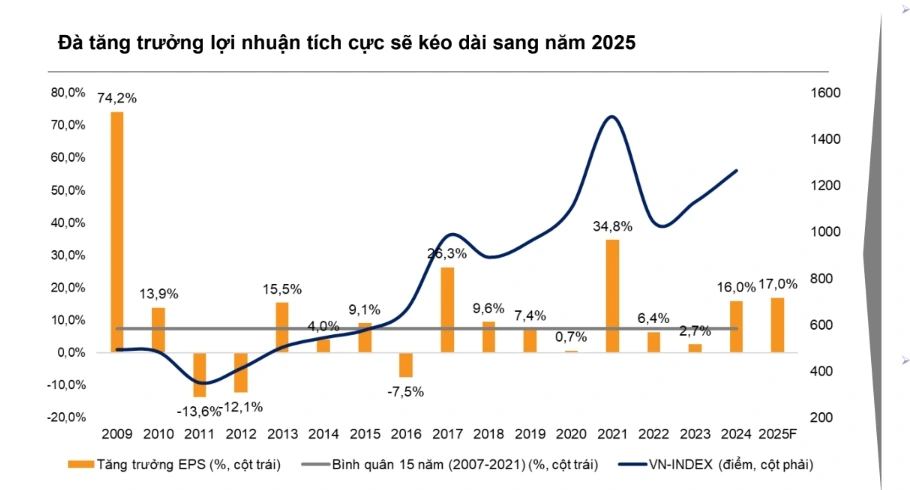 Theo các chuyên gia, dựa trên đà phục hồi của năm 2024 với tăng trưởng lợi nhuận đạt khoảng 16%, dự báo lợi nhuận của các công ty niêm yết trên HOSE sẽ tăng trưởng 17% vào năm 2025, được hỗ trợ bởi: cam kết mạnh mẽ của chính phủ Việt Nam trong việc thúc đẩy đầu tư công, đặt mục tiêu tăng trưởng GDP ở mức 7,5% và hướng tới mức tham vọng là 8,0%.