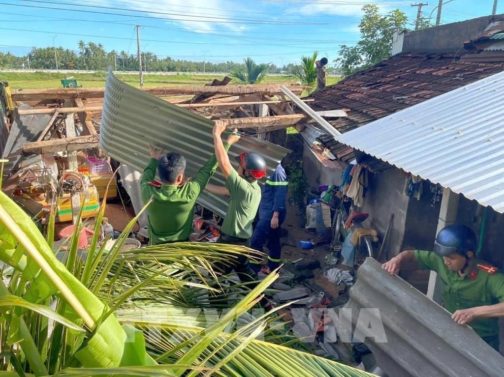 Lực lượng Công an tỉnh Gia Lai giúp người dân dựng lại mái nhà bị tốc mái do bão số 13. Ảnh: Sỹ Thắng - TTXVN