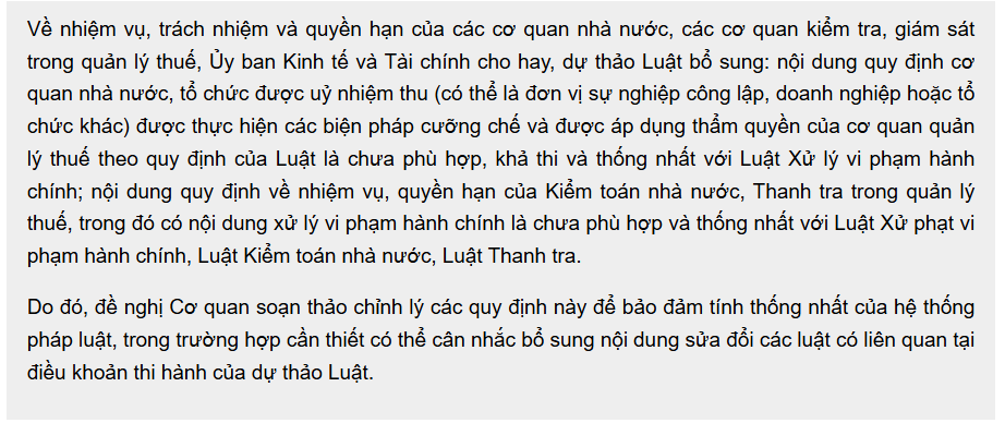 Do đó, Uỷ ban Kinh tế và Tài chính đề nghị Chính phủ nghiêm túc thực hiện ý kiến kết luận của Ủy ban Thường vụ Quốc hội về việc xin ý kiến cấp có thẩm quyền trước khi trình Quốc hội. Trong trường hợp đã có đầy đủ các căn cứ chính trị cần thiết, cần quy định cụ thể trong Luật về chế độ bổ sung thu nhập cho cán bộ thuế một cách phù hợp, cân đối với chế độ chính sách đang được áp dụng với các cơ quan khác. Ngoài ra, cơ chế này không nên gắn với yêu cầu có vượt thu ngân sách để tránh việc chạy theo chỉ tiêu thu khi xây dựng dự toán và không bảo đảm tính bền vững, ổn định và minh bạch.