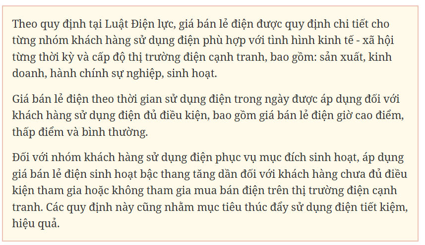 Với đặc điểm này, nhằm khuyến khích sử dụng điện tiết kiệm, hiệu quả, hiện nay rất nhiều nước trên thế giới kể cả các nước tiên tiến như Nhật Bản, Hàn Quốc hay các nước trong khu vực đều áp dụng giá điện theo các bậc thang và giá điện của bậc thang sau cùng cao hơn so với bậc thang đầu tương tự như Việt Nam. Thực tế áp dụng trong những năm qua cho thấy việc áp dụng giá bán điện sinh hoạt theo các bậc là đơn giản trong áp dụng, nhưng vẫn đạt được mục tiêu khuyến khích sử dụng điện tiết kiệm hiệu quả.