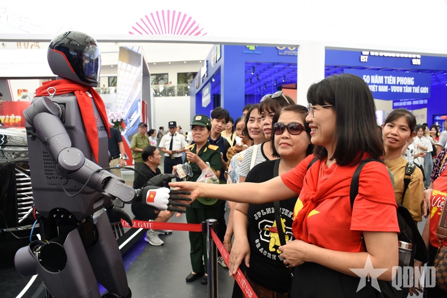 Người dân giao lưu với robot tại Triển lãm thành tựu đất nước "80 năm hành trình Độc lập - Tự do - Hạnh phúc".