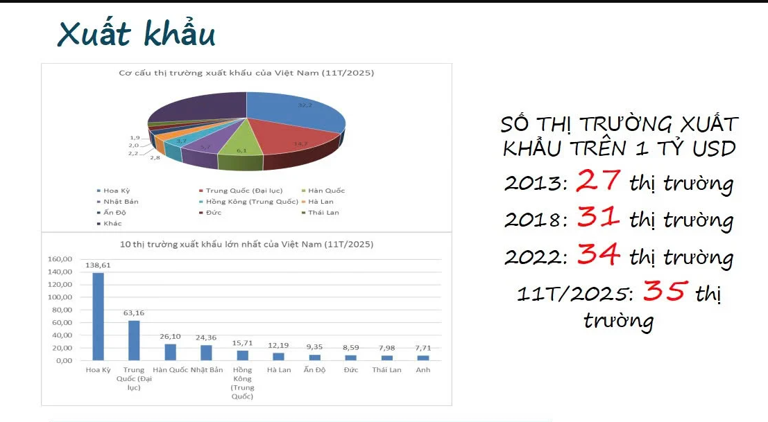 Đáng chú ý, Việt Nam đã chuyển mình từ một quốc gia nhập siêu sang xuất siêu bền vững, với năm 2025 được ghi nhận là năm xuất siêu thứ 10 liên tiếp với mức 22 tỷ USD.