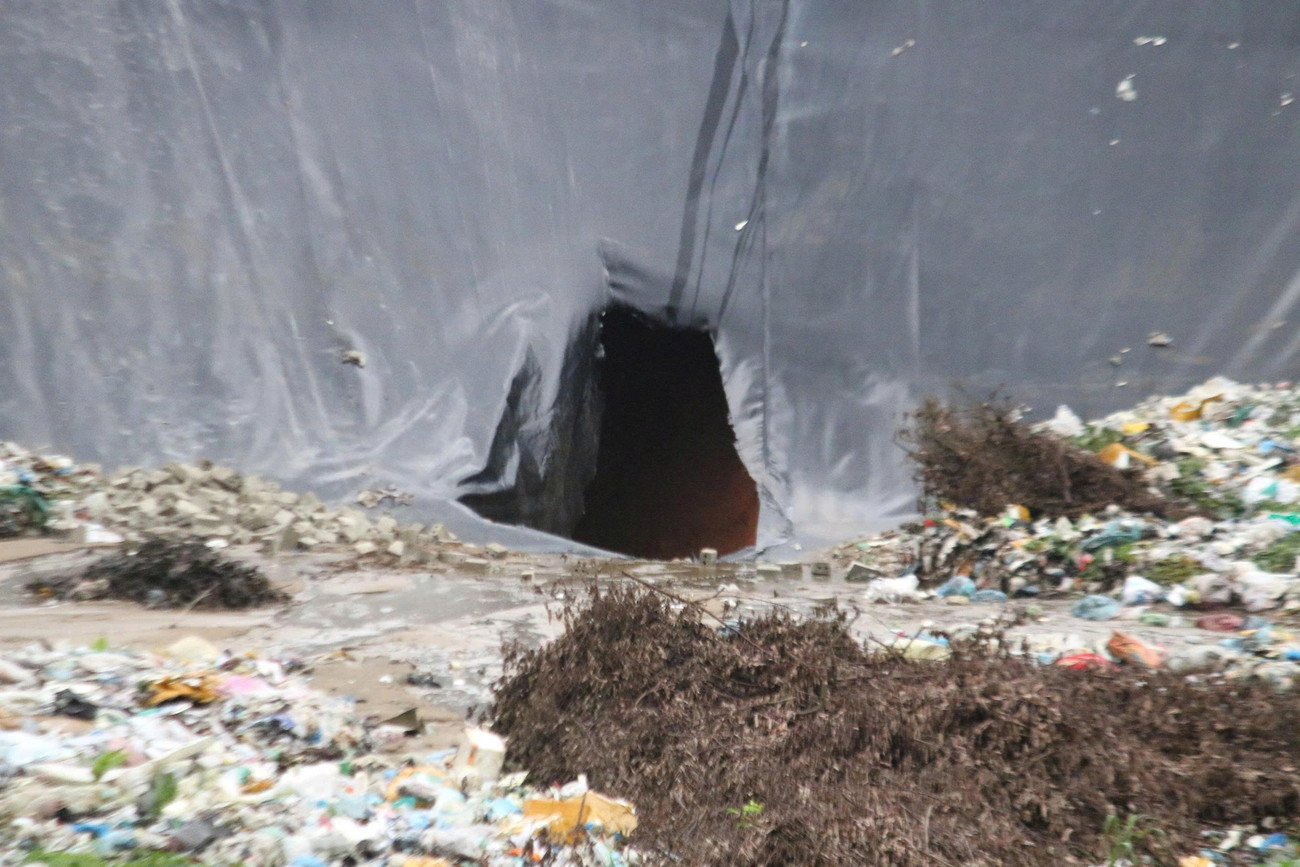 Vị trí bị vỡ trên bờ bao chứa rác. Ảnh: Ngọc Chí.
