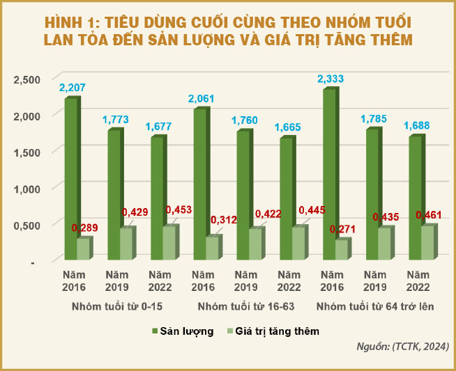 Cụ thể, phân tích dữ liệu tiêu dùng cuối cùng trong giai đoạn 2016-2022 cho thấy một xu hướng chung là tác động lan tỏa của tiêu dùng đến sản lượng giảm dần, trong khi sự lan tỏa đến giá trị tăng thêm lại gia tăng (hình 1). Điều này có nghĩa là, khi người tiêu dùng chi tiêu, tác động của họ đến tổng sản phẩm quốc nội (GDP) ngày càng nghiêng về việc đẩy giá cả lên cao hơn là thúc đẩy sản xuất tăng. Đáng chú ý, mặc dù không phải là lực lượng lao động chính tạo ra thu nhập cho nền kinh tế, các nhóm tuổi từ 0-15 và từ 64 tuổi trở lên lại thể hiện khả năng lan tỏa tiêu dùng đến giá trị tăng thêm tốt hơn so với các nhóm tuổi khác. Điều này cho thấy vai trò quan trọng của các nhóm tuổi này trong việc thúc đẩy tăng trưởng kinh tế thông qua tiêu dùng, đặc biệt là trong bối cảnh cấu trúc dân số đang thay đổi.