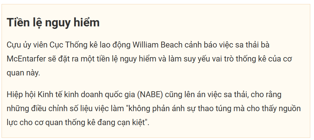 Vài giờ sau khi báo cáo việc làm được đưa ra, Tổng thống Mỹ Donald Trump đã chỉ trích kịch liệt và tuyên bố sa thải bà Erika McEntarfer - ủy viên Cục Thống kê lao động, cáo buộc bà này thao túng số liệu việc làm vì lý do chính trị dù không đưa ra bằng chứng nào.