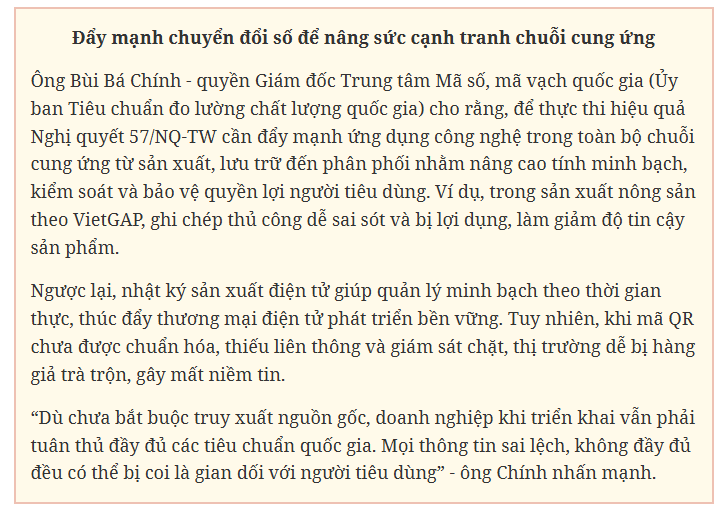 Tuy nhiên, ông Huy cũng chỉ ra rằng, thực tiễn triển khai hiện nay cho thấy, các nền tảng truy xuất tại Việt Nam vẫn còn phân tán, chủ yếu theo ngành hoặc theo từng doanh nghiệp đơn lẻ. Thiếu hụt một cơ sở dữ liệu tập trung khiến cơ quan quản lý gặp khó trong giám sát toàn diện, còn doanh nghiệp lại phải gánh chi phí cao khi mỗi bên áp dụng một công nghệ riêng.