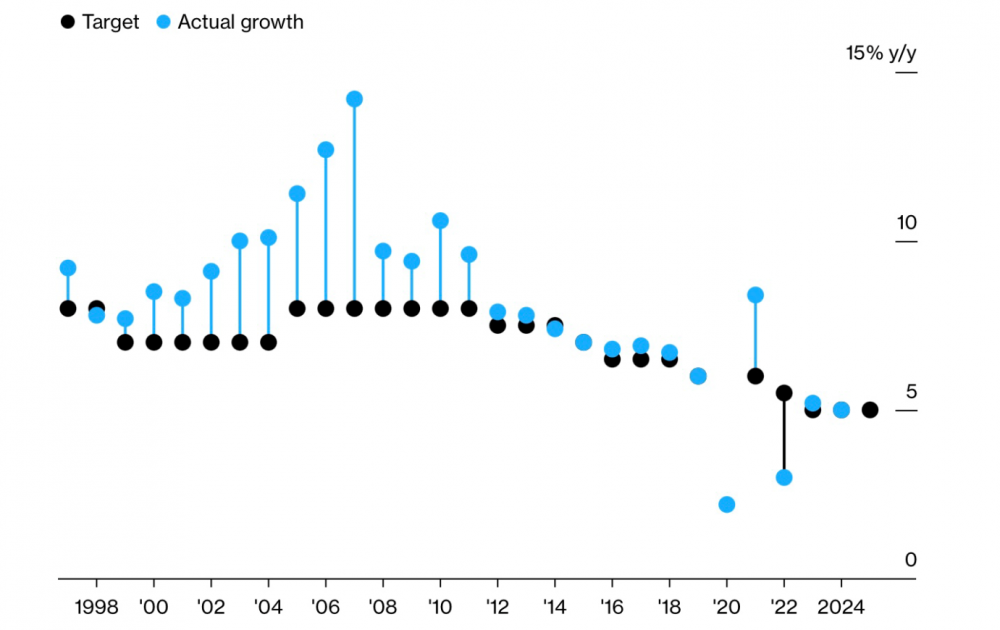 Biểu đồ: So sánh mục tiêu và thực tế tăng trưởng của Trung quốc qua các năm (chấm xanh phản ánh thực tế) - Nguồn: Dữ liệu từ Cục Thống kê quốc gia Trung Quốc về mục tiêu tăng trường