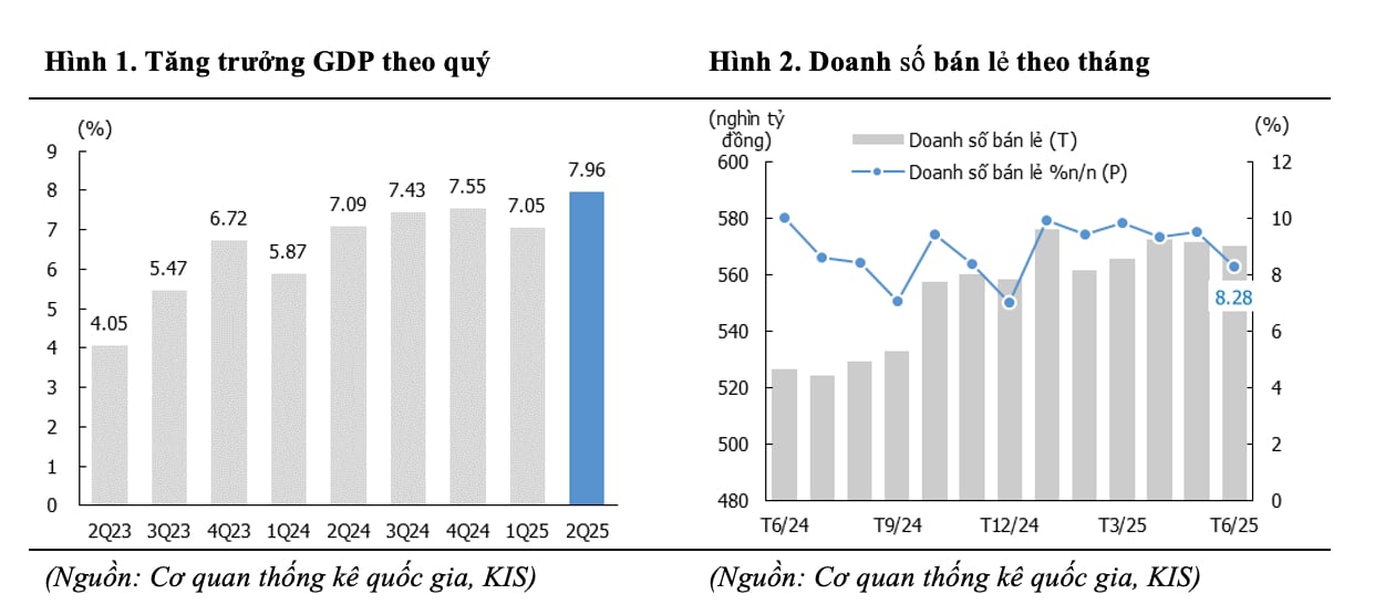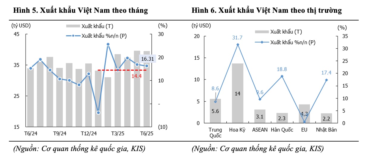 Theo Chứng khoán KIS, GDP quý II/2025 ghi nhận tăng trưởng nhanh hơn, được thúc đẩy bởi đợt dồn đơn hàng xuất khẩu trong giai đoạn “ưu đãi thuế”. Theo đó, kim ngạch xuất khẩu quý II tăng tới 18% so với cùng kỳ, cao hơn 7,41 điểm phần trăm so với quý I. Tuy nhiên, bức tranh vĩ mô của Việt Nam trong tháng 6 cho thấy một câu chuyện đa chiều.