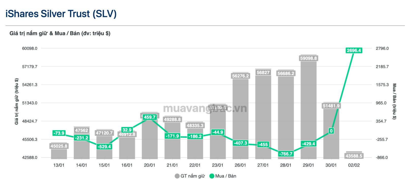 Theo cập nhật mới nhất từ muavangbac.vn, quỹ bạc lớn nhất thế giới iShare Silver Trust (SLV) vừa bất ngờ tung gần 3 tỷ USD (khoảng hơn 500 tấn) để mua bạc trong ngày 2/2, xác lập kỷ lục về giá trị giao dịch trong ngày. Con số này thậm chí còn tương đương với tổng giá trị mà quỹ bán ra từ đầu năm.