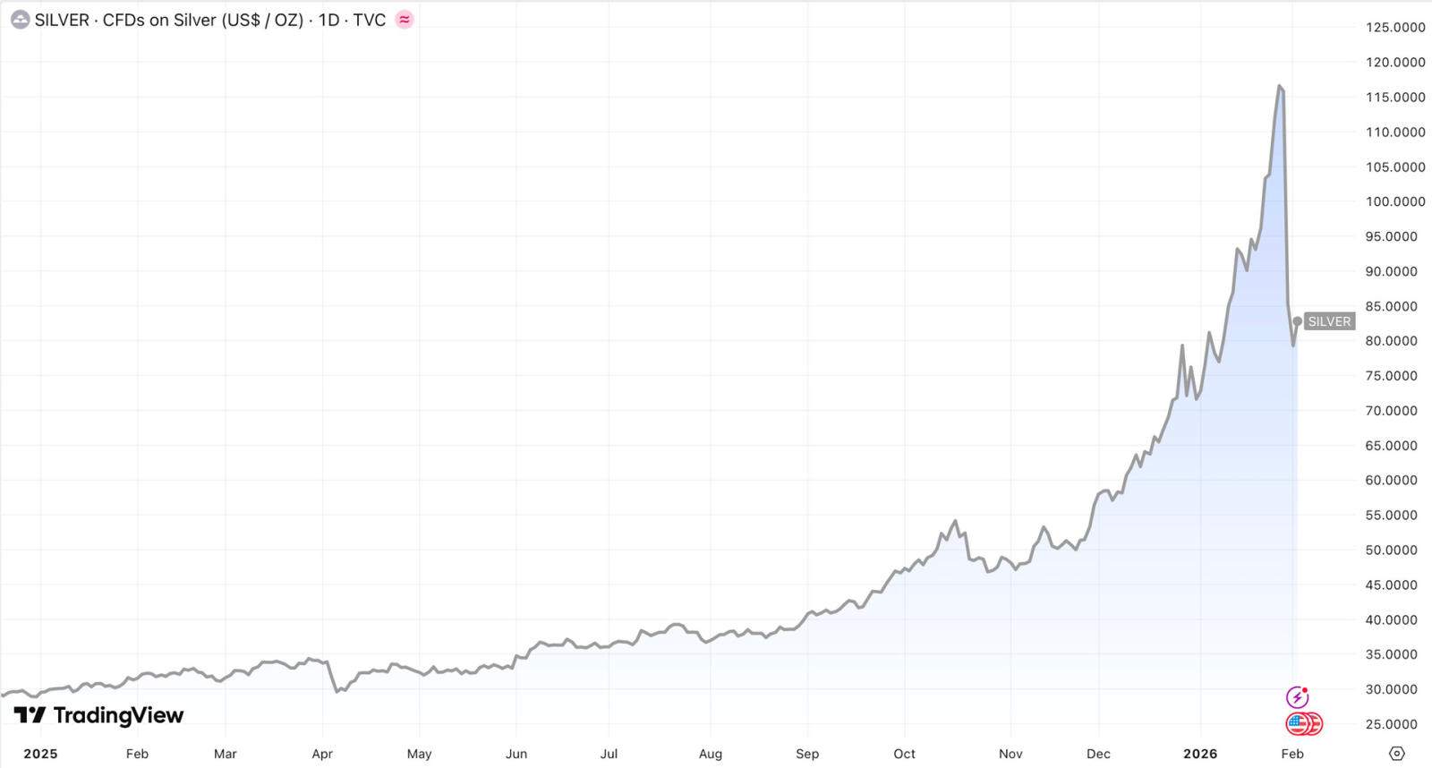 Với việc cá mập vung tiền bắt đáy, giá bạc đang hồi phục trở lại trên vùng 80 USD/oz. Mức giá này vẫn còn thấp hơn nhiều so với đỉnh, có thời điểm vượt 120 USD vào cuối tháng 1. Tuy nhiên, so với một năm trước, giá bạc vẫn cao hơn khoàng 150%.
