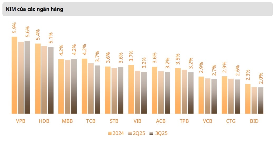MBB có chất lượng tài sản cải thiện với tỷ lệ nợ xấu (NPL) giảm còn 1,87% (-36đcb svck), nợ xấu mở rộng giảm còn 3,23% (-89đcb svck). Tỷ lệ bao phủ nợ xấu (LLR) tăng nhẹ lên 79,2% (+10đcb svck). Mặc dù tỷ lệ CASA tăng mạnh, cùng với giấy tờ có giá tăng, chi phí vốn tăng nhưng MBB cũng có NIM tăng trong quý 3/2025, được hỗ trợ bởi mức phục hồi của lợi suất tài sản.