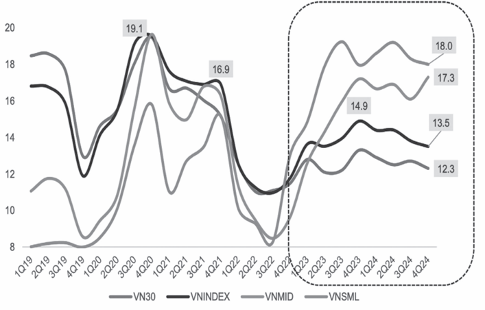 Diễn biến P/E của các chỉ số VNIndex, VN30, VNX50 và VNMID.