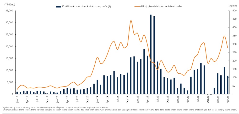 Nhà đầu tư cá nhân trong nước mở mới 110.622 tài khoản trong tháng 4, đưa lũy kế lượng tài khoản mở mới kể từ đầu năm lên khoảng 513.500 tài khoản chứng khoán. Tổng cộng cuối tháng 4/2024, Việt Nam có hơn 7,7 triệu tài khoản chứng khoán cá nhân, tương đương khoảng 7,7% dân số.