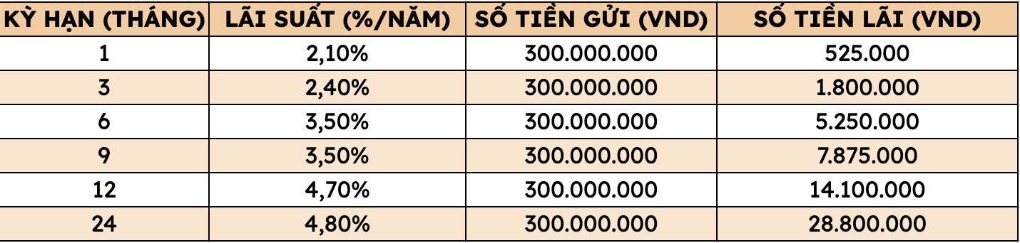 Gửi 300 triệu đồng tại Agribank nhận lãi bao nhiêu tại các kỳ hạn?