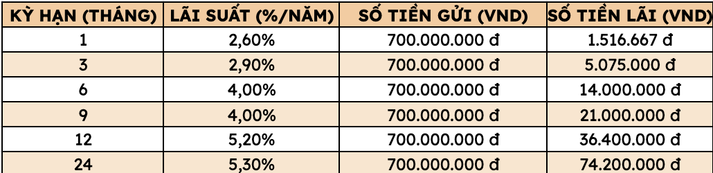 Gửi tiết kiệm 700 triệu đồng tại Agribank nhận lãi bao nhiêu tại các kỳ hạn?