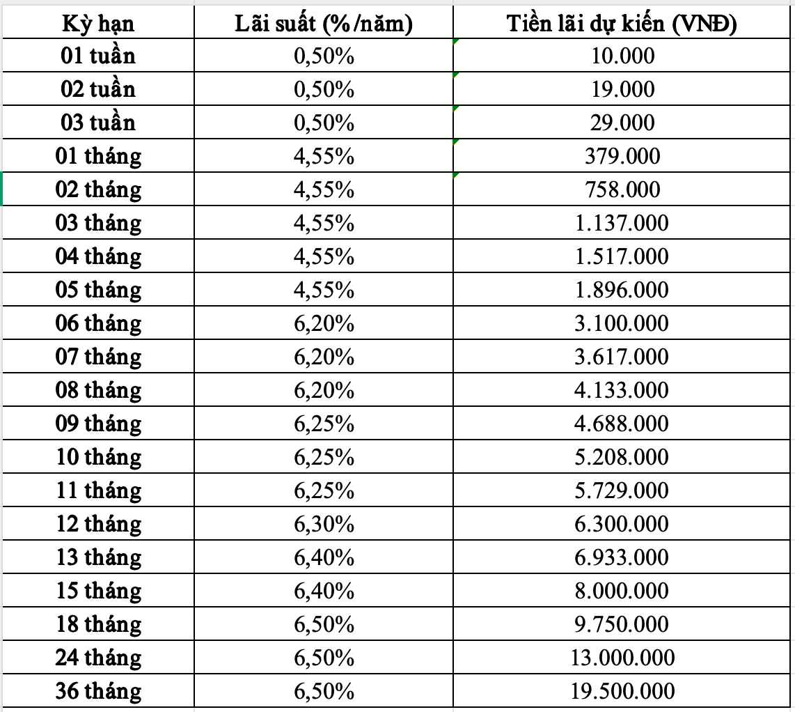 Gửi 100 triệu đồng tại Bac A Bank nhận lãi bao nhiêu tại các kỳ hạn?