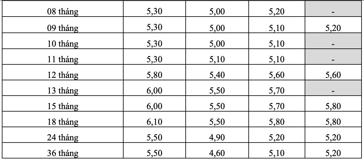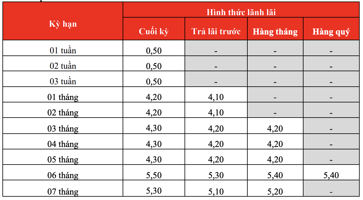 Theo đó, lãi suất các kỳ hạn ngắn 1-2 tháng là 4,20%/năm 5; kỳ hạn 3-5 tháng là 4,30%/năm6.