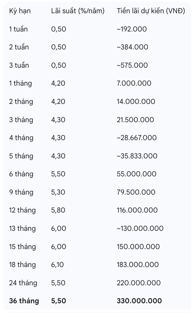 Nếu khách hàng gửi dài hạn 18 tháng sẽ nhận được mức lãi suất năm cao nhất (6,10%) với 183 triệu đồng tiền lãi. Tuy nhiên, phương án tối ưu lợi nhuận nhất cho nguồn tiền nhàn rỗi dài hạn vẫn là kỳ hạn 36 tháng, với tổng số tiền lãi thực nhận lên tới 330 triệu đồng.