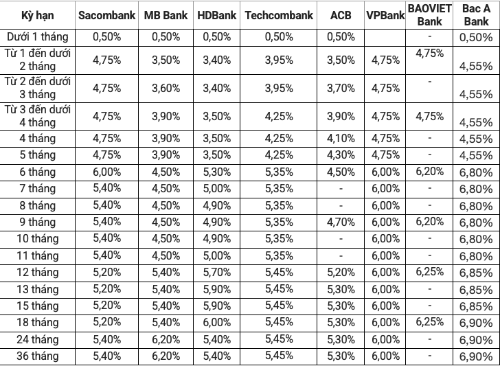 Theo biểu niêm yết hiện hành, tiền gửi kỳ hạn kỳ hạn dưới 1 tháng được huy động với mức lãi suất là 0,20%, từ 1 - 2 tháng đều giữ lãi suất 2,1%/năm; kỳ hạn 3 tháng là 2,4%/năm. Các kỳ hạn 6 tháng và 9 tháng cùng ghi nhận mức 3,5%/năm. Ở nhóm kỳ hạn dài hơn, ba ngân hàng quốc doanh áp dụng lãi suất 5,2%/năm cho tiền gửi 12 tháng và cao nhất là 5,3% cho kỳ hạn 24 tháng trở lên.