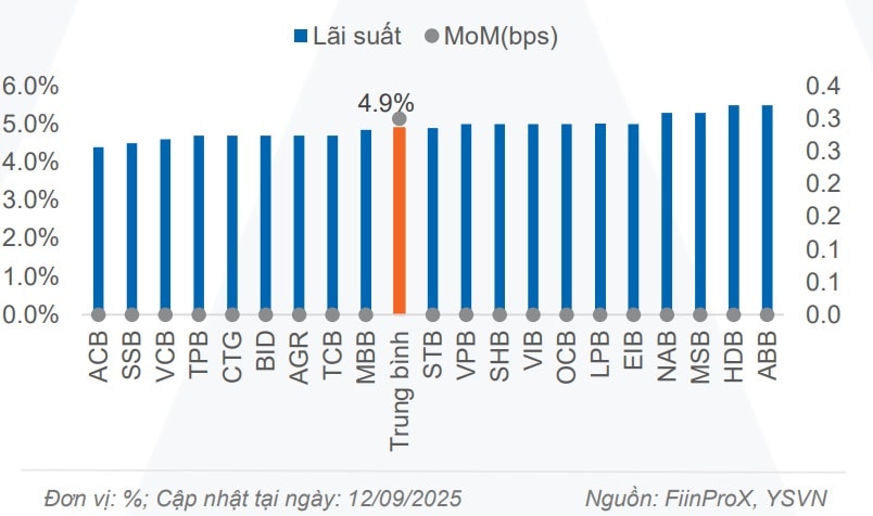 Theo thống kê, đến cuối quý I/2025, lãi suất tiết kiệm bằng Việt Nam đồng hầu hết đều duy trì mức thấp tại các NHTM ở dưới 6%/ năm. Từ tháng tháng 6 đến tháng 9, lãi suất tiền gửi bằng Việt Nam đồng vẫn tiếp tục duy trì ở vùng thấp, đặc biệt là ở kỳ hạn ngắn. Cụ thể, lãi suất kỳ hạn dưới 6 tháng dao động 1,6 - 5,6%/năm; kỳ hạn từ 6 đến dưới 12 tháng ở mức 4,6 - 5,9%/năm.